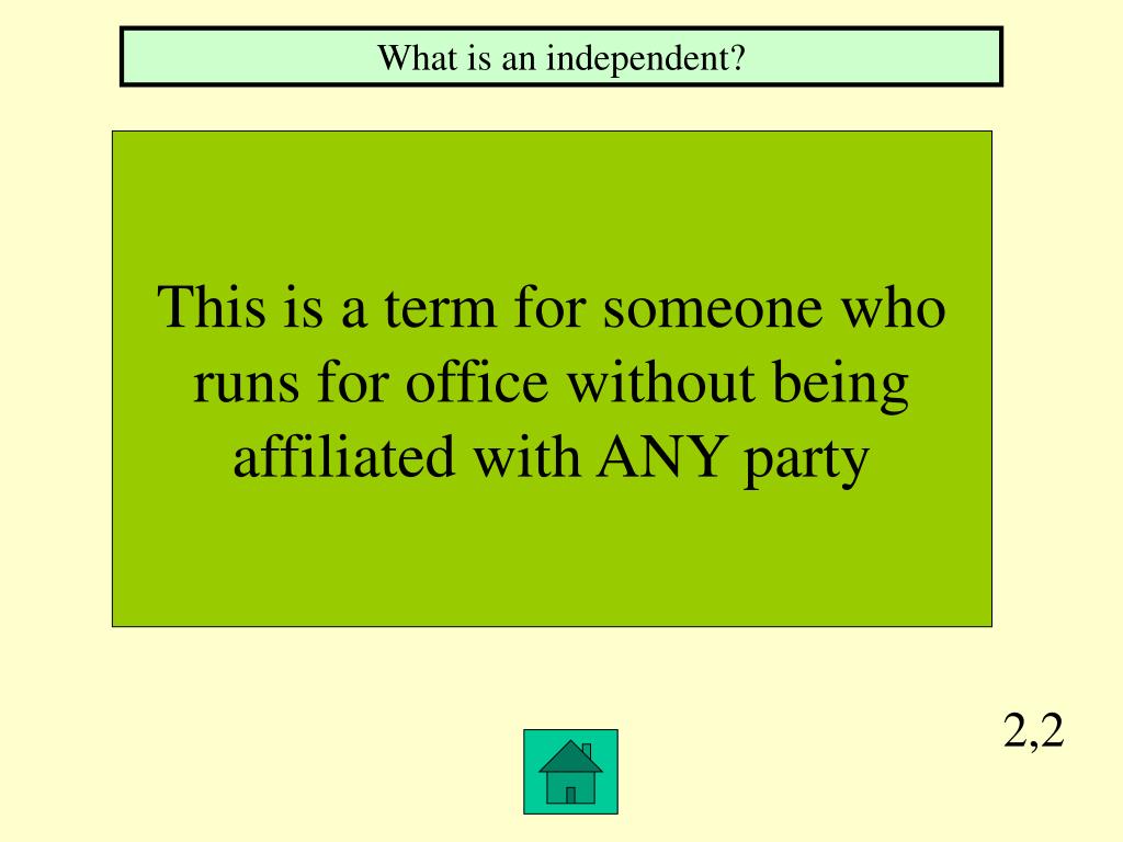 2,2 What is an independent? This is a term for someone who runs for office without being affiliated with ANY party