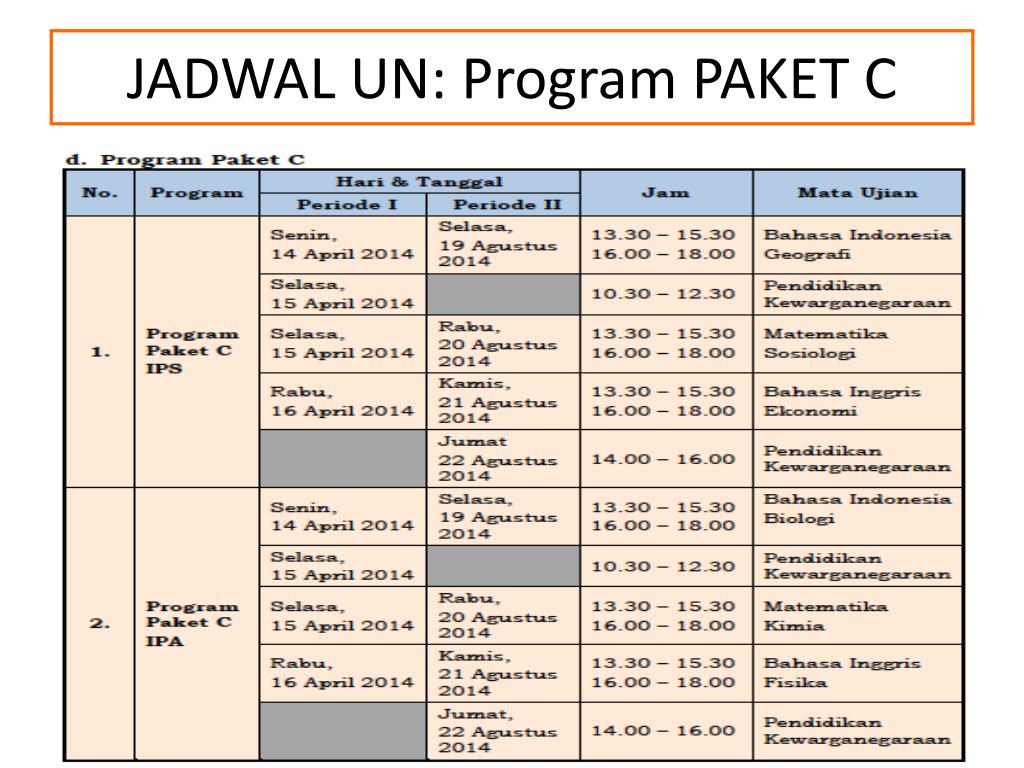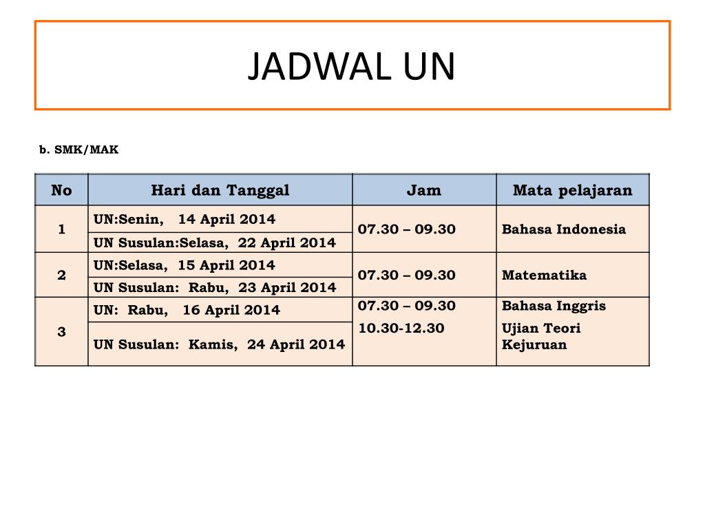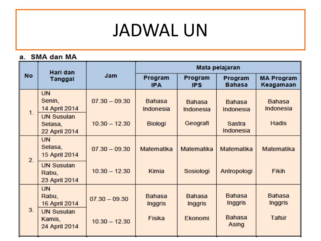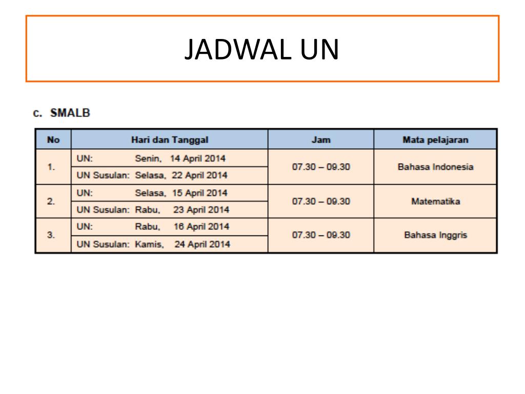 JADWAL UN • SMA/MA, SMALB, SMK/MAK, Paket C, dan Paket C Kejuruan: 14-16 April 2014. • SMP/MTs, SMPLB, Program Paket B/Wustha: 5 – 8 Mei 2014. • UN Susulan: 1 minggu setelah pelaksanaan UN yang berkaitan. • UN untuk Pendidikan Kesetaraan periode Kedua: 19-22 Agustus 2014.