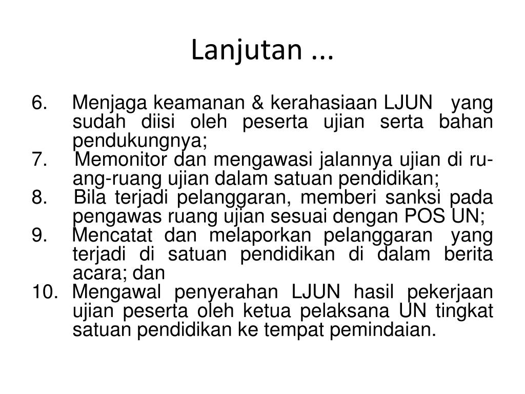 Lanjutan ... 6. Menjagakeamanan& kerahasiaan LJUN yangsudahdiisiolehpesertaujiansertabahanpendukungnya; 7. Memonitordanmengawasijalannyaujian di ru-ang-ruangujiandalamsatuanpendidikan; 8. Bilaterjadipelanggaran, memberisanksipadapengawasruangujiansesuaidengan POS UN; 9. Mencatatdanmelaporkanpelanggaranyang terjadidi satuanpendidikan di dalamberitaacara; dan 10. Mengawalpenyerahan LJUN hasilpekerjaanujianpesertaolehketuapelaksana UN tingkatsatuanpendidikanketempatpemindaian.