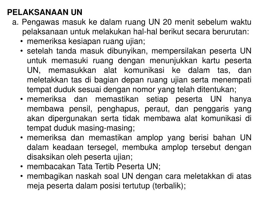 PELAKSANAAN UN • a. Pengawas masuk ke dalam ruang UN 20 menit sebelum waktupelaksanaan untuk melakukan hal-hal berikut secara berurutan: • memeriksa kesiapan ruang ujian; • setelah tanda masuk dibunyikan, mempersilakan peserta UN untuk memasuki ruang dengan menunjukkan kartu peserta UN, memasukkanalatkomunikasikedalamtas, dan meletakkan tas di bagian depan ruang ujian serta menempati tempat duduk sesuai dengan nomor yang telah ditentukan; • memeriksa dan memastikan setiap peserta UN hanya membawa pensil, penghapus, peraut, dan penggaris yang akan dipergunakan sertatidakmembawaalatkomunikasiditempat duduk masing-masing; • memeriksa dan memastikan amplop yang berisibahan UN dalam keadaan tersegel, membuka amplop tersebutdengandisaksikan oleh peserta ujian; • membacakan Tata Tertib PesertaUN; • membagikan naskah soal UN dengan cara meletakkan di atas meja peserta dalam posisi tertutup (terbalik);