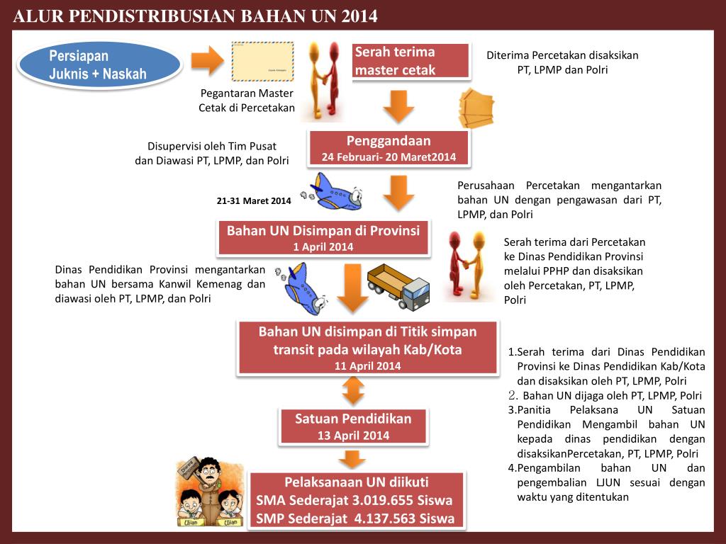 ALURPENDISTRIBUSIANBAHANUN2014 Persiapan Juknis+Naskah Serah terima master cetak Diterima Percetakan disaksikan PT, LPMP dan Polri Pegantaran Master Cetak di Percetakan Penggandaan 24 Februari- 20 Maret2014 Disupervisi oleh Tim Pusat dan Diawasi PT, LPMP, dan Polri Perusahaan Percetakan mengantarkan bahan UN dengan pengawasan dari PT, LPMP, dan Polri 21-31 Maret 2014 Bahan UN Disimpan di Provinsi 1 April 2014 Serah terima dari Percetakan ke Dinas Pendidikan Provinsi melalui PPHP dan disaksikan oleh Percetakan, PT, LPMP, Polri Dinas Pendidikan Provinsi mengantarkan bahan UN bersama Kanwil Kemenag dan diawasi oleh PT, LPMP, dan Polri Bahan UN disimpan di Titik simpan transit pada wilayah Kab/Kota 11 April 2014 • Serah terima dari Dinas Pendidikan Provinsi ke Dinas Pendidikan Kab/Kota dan disaksikan oleh PT, LPMP, Polri • Bahan UN dijaga oleh PT, LPMP, Polri • Panitia Pelaksana UN Satuan Pendidikan Mengambil bahan UN kepada dinas pendidikan dengan disaksikanPercetakan, PT, LPMP, Polri • Pengambilan bahan UN dan pengembalian LJUN sesuai dengan waktu yang ditentukan Satuan Pendidikan 13 April 2014 Pelaksanaan UN diikuti • SMA Sederajat3.019.655 Siswa • SMP Sederajat 4.137.563 Siswa
