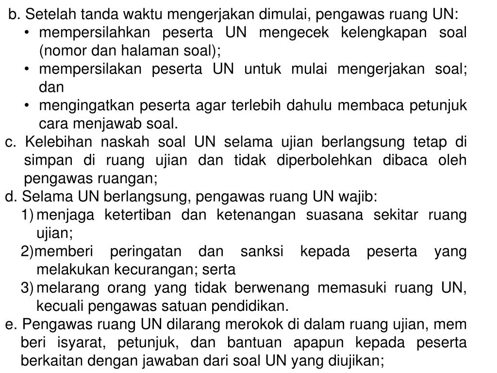 b. Setelah tanda waktu mengerjakan dimulai, pengawas ruang UN: • mempersilahkanpeserta UN mengecek kelengkapan soal (nomor dan halaman soal); • mempersilakan peserta UN untuk mulai mengerjakan soal;dan • mengingatkan peserta agar terlebih dahulu membaca petunjuk cara menjawab soal. • c.Kelebihan naskah soal UN selama ujian berlangsung tetap di simpan di ruang ujian dan tidak diperbolehkan dibaca oleh pengawas ruangan; • d. Selama UN berlangsung, pengawas ruang UN wajib: 1)menjaga ketertiban dan ketenangan suasana sekitar ruang ujian; 2)memberi peringatan dan sanksi kepada peserta yang melakukan kecurangan; serta 3)melarang orang yang tidakberwenangmemasuki ruang UN, kecuali pengawas satuan pendidikan. • e. Pengawas ruang UN dilarang merokok di dalam ruang ujian, mem beri isyarat, petunjuk, dan bantuan apapun kepada peserta berkaitan dengan jawaban dari soal UN yang diujikan;
