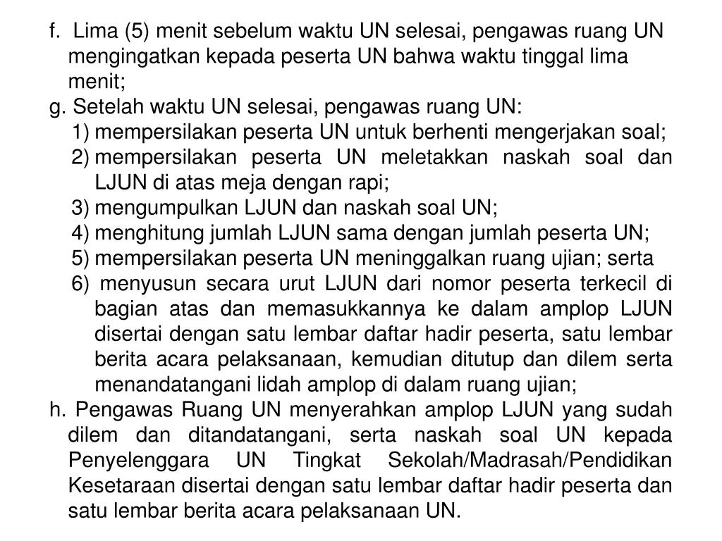 f. Lima (5) menit sebelum waktu UN selesai, pengawas ruang UN mengingatkan kepada peserta UN bahwa waktu tinggal lima menit; • g. Setelah waktu UN selesai, pengawas ruang UN: 1)mempersilakan peserta UN untuk berhenti mengerjakan soal; 2)mempersilakan peserta UN meletakkan naskah soal dan LJUN di atas meja dengan rapi; 3)mengumpulkan LJUN dan naskah soal UN; 4)menghitung jumlah LJUN sama dengan jumlah peserta UN; 5)mempersilakan peserta UN meninggalkan ruang ujian; serta 6) menyusun secara urut LJUN dari nomor peserta terkecil di bagian atas dan memasukkannya ke dalam amplop LJUN disertai dengan satu lembar daftar hadir peserta, satu lembar berita acara pelaksanaan, kemudian ditutup dan dilem serta menandatanganilidahamplop di dalam ruang ujian; • h.Pengawas Ruang UN menyerahkan amplop LJUN yang sudah dilem dan ditandatangani, serta naskah soal UN kepada Penyelenggara UN Tingkat Sekolah/Madrasah/Pendidikan Kesetaraan disertai dengan satu lembar daftar hadir peserta dan satu lembar berita acara pelaksanaan UN.