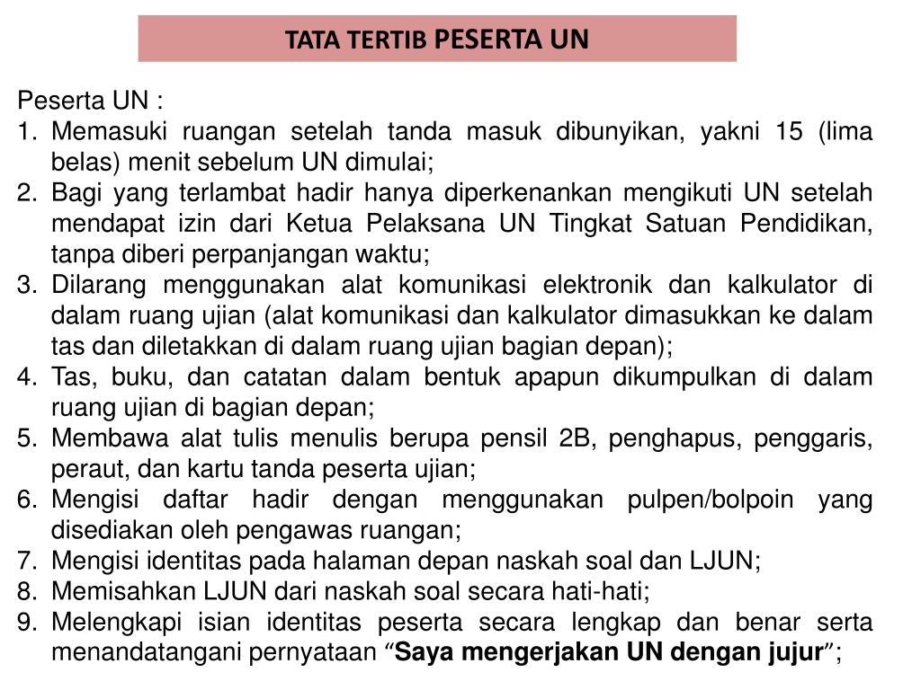TATA TERTIB PESERTA UN Peserta UN : • Memasuki ruangan setelah tanda masuk dibunyikan, yakni 15 (lima belas) menit sebelum UN dimulai; • Bagiyang terlambat hadir hanya diperkenankan mengikuti UN setelah mendapat izin dari Ketua Pelaksana UN Tingkat Satuan Pendidikan, tanpa diberi perpanjangan waktu; • Dilarang menggunakan alat komunikasi elektronik dan kalkulator di dalam ruang ujian (alat komunikasi dan kalkulator dimasukkan ke dalam tas dan diletakkan di dalam ruang ujian bagian depan); • Tas, buku, dan catatan dalam bentuk apapun dikumpulkan di dalam ruang ujian di bagian depan; • Membawa alat tulis menulis berupa pensil 2B, penghapus, penggaris,peraut, dan kartu tanda peserta ujian; • Mengisi daftar hadir dengan menggunakan pulpen/bolpoin yang disediakan oleh pengawas ruangan; • Mengisi identitas pada halaman depan naskah soal dan LJUN; • Memisahkan LJUN dari naskah soal secara hati-hati; • Melengkapi isian identitas peserta secara lengkap dan benar serta menandatangani pernyataan “Sayamengerjakan UN dengan jujur”;