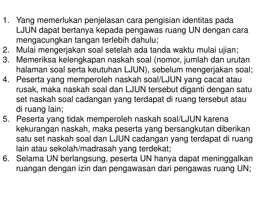 Yang memerlukan penjelasan cara pengisian identitas pada LJUN dapat bertanya kepada pengawas ruang UN dengan cara mengacungkan tangan terlebih dahulu; • Mulai mengerjakan soal setelah ada tanda waktu mulai ujian; • Memeriksakelengkapannaskahsoal (nomor, jumlahdanurutanhalamansoalsertakeutuhan LJUN), sebelummengerjakansoal; • Pesertayang memperoleh naskah soal/LJUN yang cacat atau rusak, maka naskah soal dan LJUN tersebut diganti dengan satu set naskah soal cadangan yang terdapat di ruang tersebut atau di ruang lain; • Peserta yang tidak memperoleh naskah soal/LJUN karena kekurangan naskah, maka peserta yang bersangkutan diberikan satu set naskah soal dan LJUN cadangan yang terdapat di ruang lain atau sekolah/madrasah yang terdekat; • Selama UN berlangsung, peserta UN hanya dapat meninggalkan ruangan dengan izin dan pengawasan dari pengawas ruang UN;