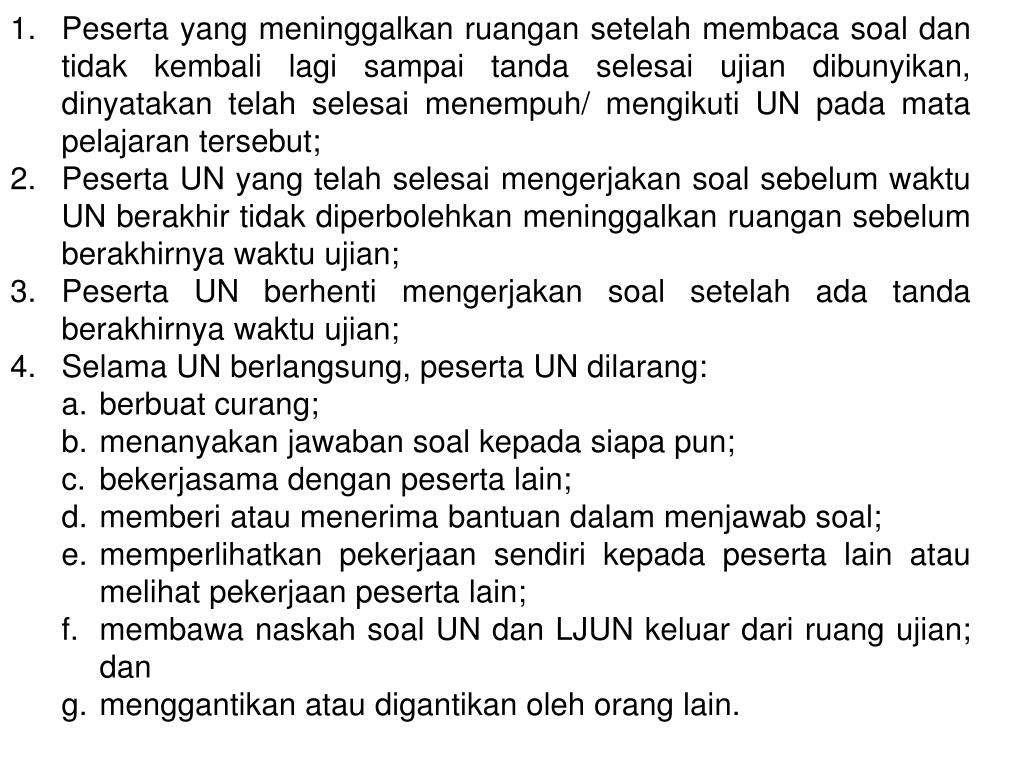 Peserta yang meninggalkan ruangan setelah membaca soal dan tidak kembali lagi sampai tanda selesai ujian dibunyikan, dinyatakan telah selesai menempuh/ mengikuti UN pada mata pelajaran tersebut; • Peserta UN yang telah selesai mengerjakan soal sebelum waktu UN berakhir tidak diperbolehkan meninggalkan ruangan sebelum berakhirnya waktu ujian; • Peserta UN berhenti mengerjakan soal setelah ada tanda berakhirnya waktu ujian; • Selama UN berlangsung, peserta UN dilarang: • berbuatcurang; • menanyakan jawaban soal kepada siapa pun; • bekerjasama dengan peserta lain; • memberi atau menerima bantuan dalam menjawab soal; • memperlihatkan pekerjaan sendiri kepada peserta lain atau melihat pekerjaan peserta lain; • membawa naskah soal UN dan LJUN keluar dari ruang ujian; dan • menggantikan atau digantikan oleh orang lain.