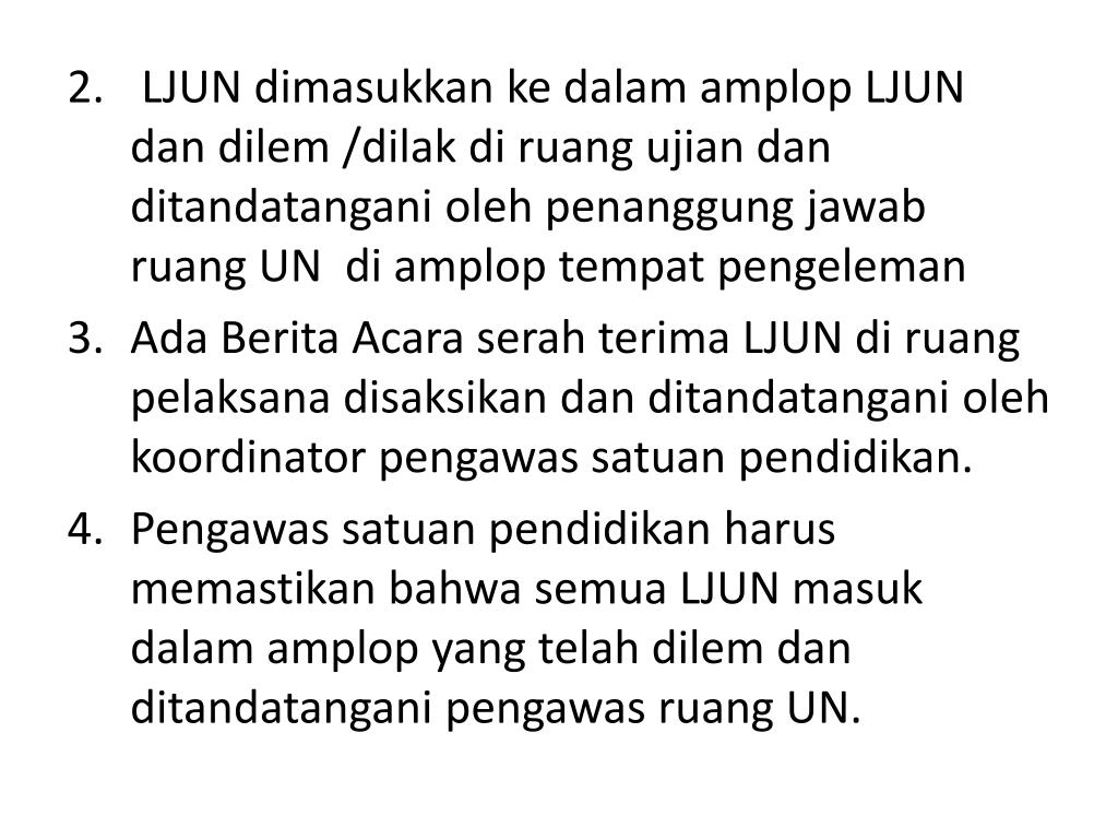 LJUN dimasukkan ke dalam amplop LJUN dan dilem /dilak di ruang ujian dan ditandatangani oleh penanggung jawab ruang UN di amplop tempat pengeleman • Ada Berita Acara serah terima LJUN di ruang pelaksana disaksikan dan ditandatangani oleh koordinator pengawas satuan pendidikan. • Pengawas satuan pendidikan harus memastikan bahwa semua LJUN masuk dalam amplop yang telah dilem dan ditandatangani pengawas ruang UN.