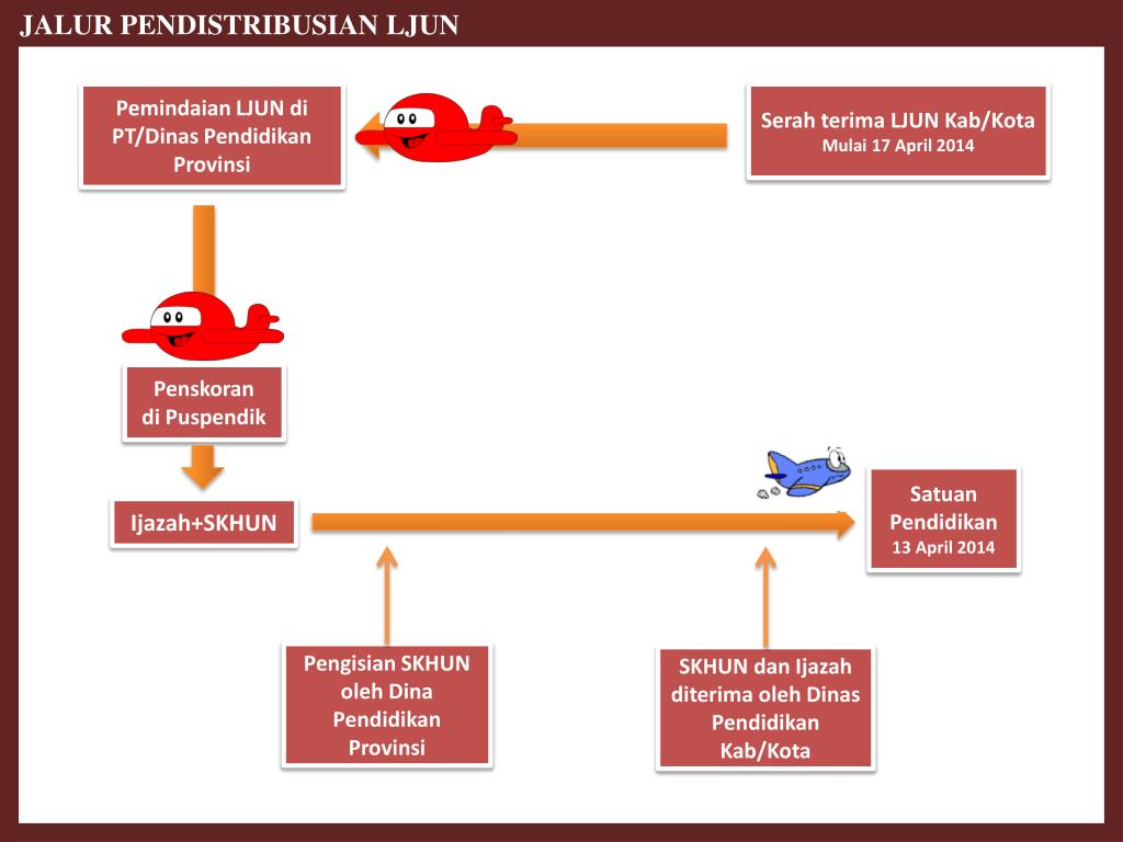 JALUR PENDISTRIBUSIAN LJUN Pemindaian LJUN di PT/Dinas Pendidikan Provinsi Serah terima LJUN Kab/Kota Mulai17 April 2014 Penskoran di Puspendik Satuan Pendidikan 13 April 2014 Ijazah+SKHUN Pengisian SKHUN oleh Dina Pendidikan Provinsi SKHUN dan Ijazah diterima oleh Dinas Pendidikan Kab/Kota