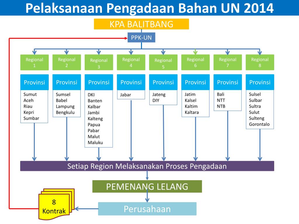 Pelaksanaan Pengadaan Bahan UN 2014 KPA BALITBANG PPK-UN Regional 2 Regional3 Regional 4 Regional5 Regional 6 Regional 7 Regional 8 Regional 1 Provinsi Provinsi Provinsi Provinsi Provinsi Provinsi Provinsi Provinsi Bali NTT NTB Sulsel Sulbar Sultra Sulut Sulteng Gorontalo Sumut Aceh Riau Kepri Sumbar Jatim Kalsel Kaltim Kaltara Sumsel Babel Lampung Bengkulu Jateng DIY DKI Banten Kalbar Jambi Kalteng Papua Pabar Malut Maluku Jabar Setiap Region Melaksanakan Proses Pengadaan PEMENANG LELANG 8 Kontrak Perusahaan