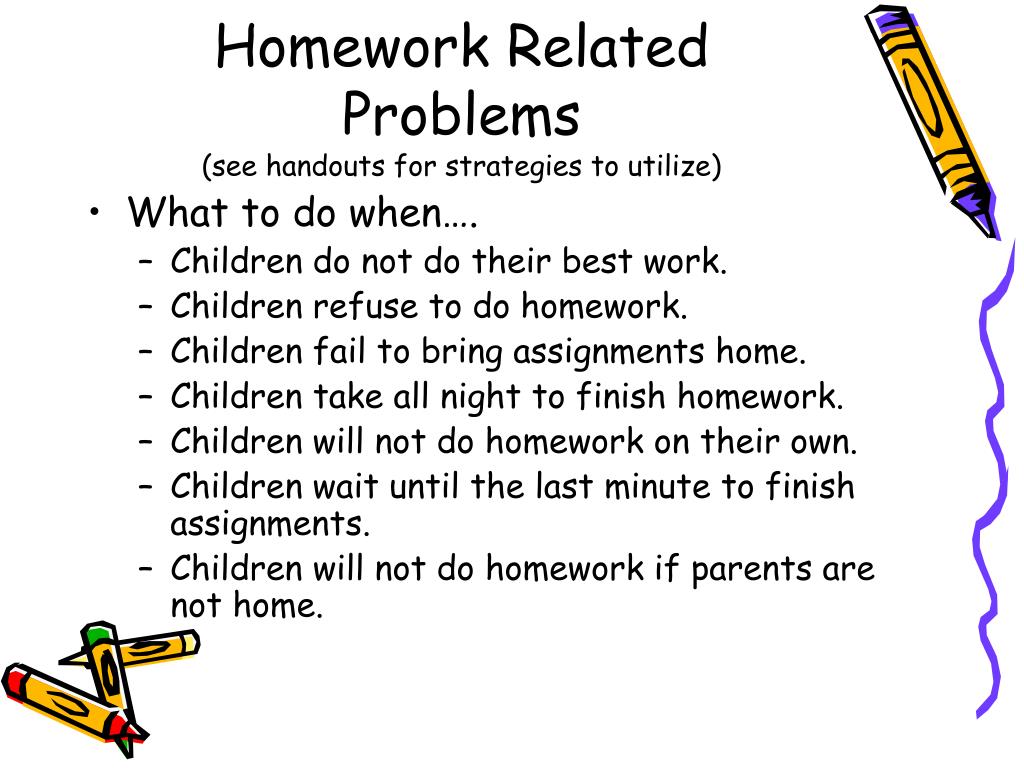 Homework Related Problems (see handouts for strategies to utilize) • What to do when…. • Children do not do their best work. • Children refuse to do homework. • Children fail to bring assignments home. • Children take all night to finish homework. • Children will not do homework on their own. • Children wait until the last minute to finish assignments. • Children will not do homework if parents are not home.