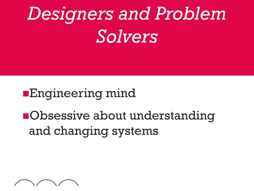 Engineering mind Obsessive about understanding and changing systems Designers and Problem Solvers