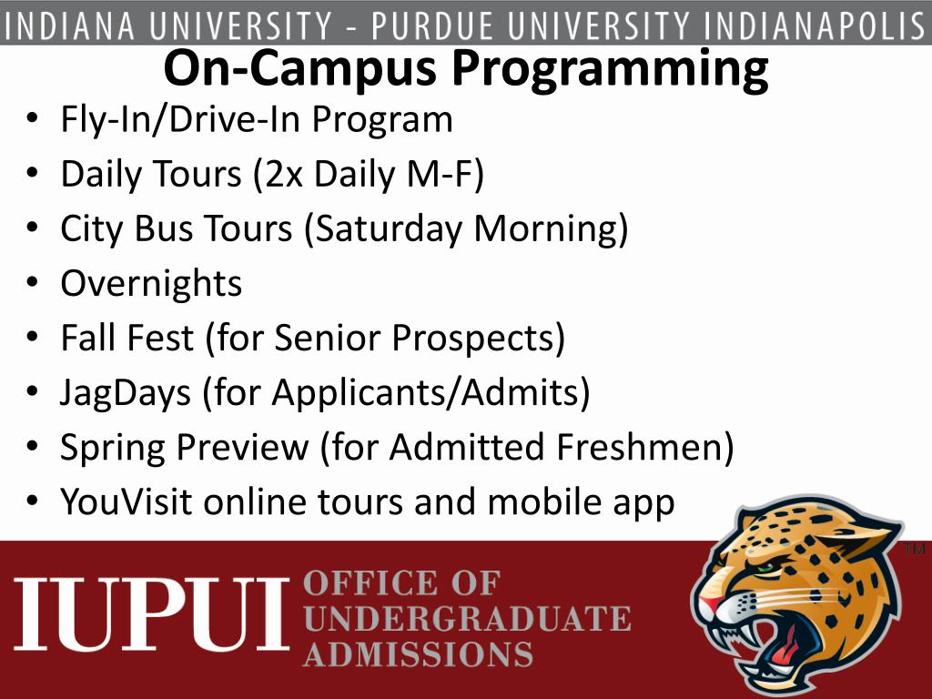 On-Campus Programming • Fly-In/Drive-In Program • Daily Tours (2x Daily M-F) • City Bus Tours (Saturday Morning) • Overnights • Fall Fest (for Senior Prospects) • JagDays (for Applicants/Admits) • Spring Preview (for Admitted Freshmen) • YouVisit online tours and mobile app