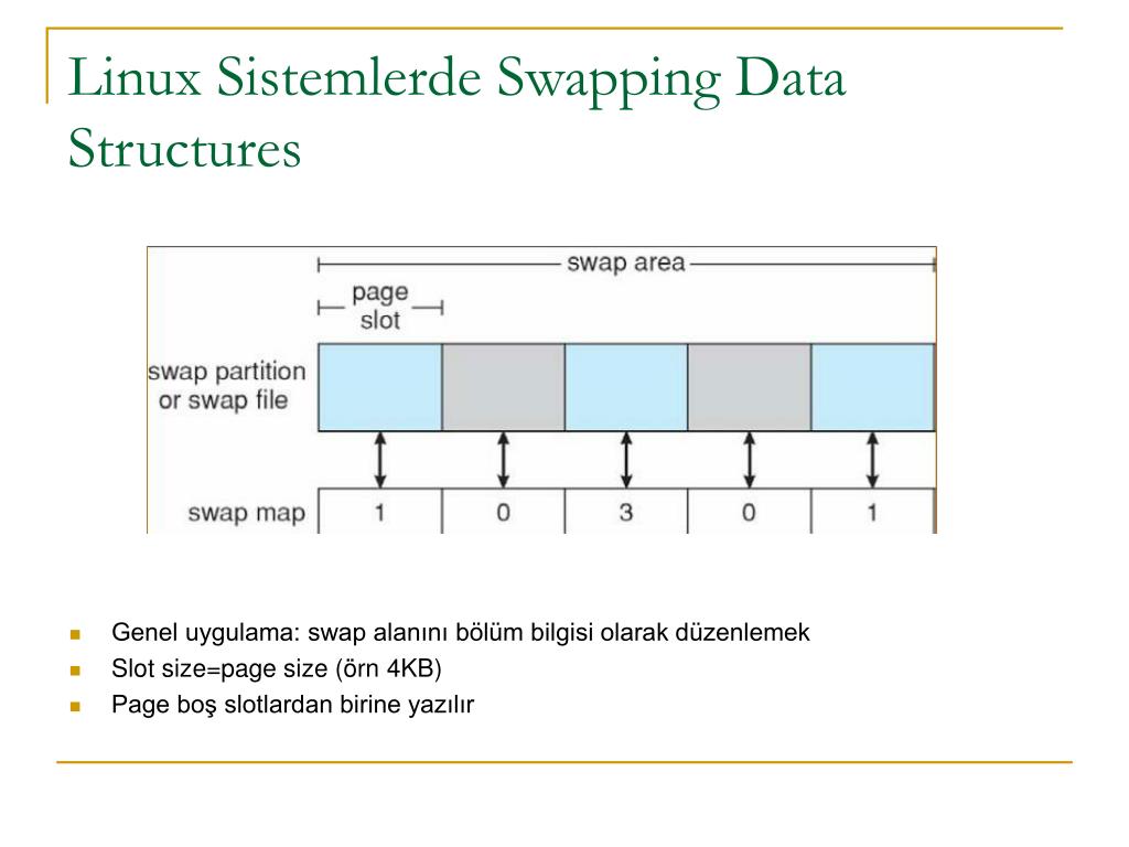 Linux Sistemlerde Swapping Data Structures • Genel uygulama: swap alanını bölüm bilgisi olarak düzenlemek • Slot size=page size (örn 4KB) • Page boş slotlardan birine yazılır