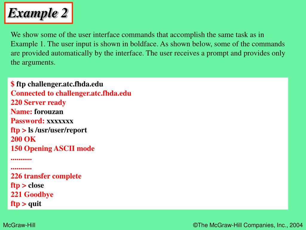 Example 2 We show some of the user interface commands that accomplish the same task as in Example 1. The user input is shown in boldface. As shown below, some of the commands are provided automatically by the interface. The user receives a prompt and provides only the arguments. $ ftp challenger.atc.fhda.edu Connected to challenger.atc.fhda.edu 220 Server ready Name: forouzan Password: xxxxxxx ftp > ls /usr/user/report 200 OK 150 Opening ASCII mode ........... ........... 226 transfer complete ftp > close 221 Goodbye ftp > quit
