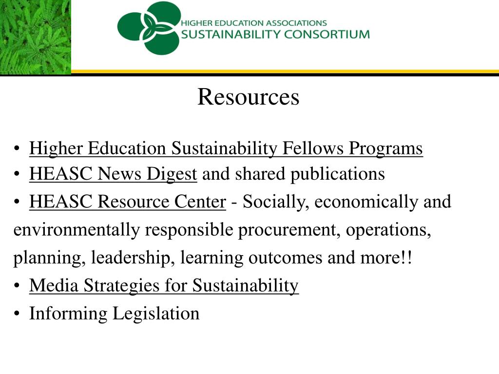 Resources • Higher Education Sustainability Fellows Programs • HEASC News Digest and shared publications • HEASC Resource Center - Socially, economically and environmentally responsible procurement, operations, planning, leadership, learning outcomes and more!! • Media Strategies for Sustainability • Informing Legislation