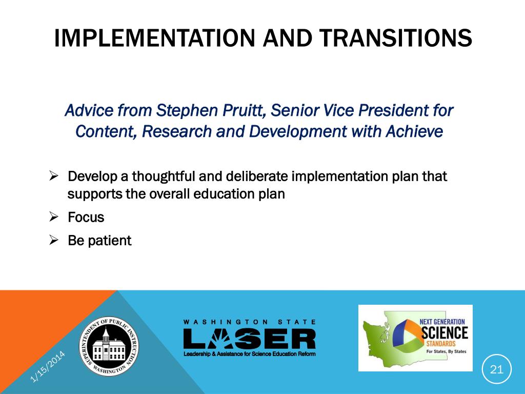 Implementation and Transitions Advice from Stephen Pruitt, Senior Vice President for Content, Research and Development with Achieve Develop a thoughtful and deliberate implementation plan that supports the overall education plan Focus Be patient