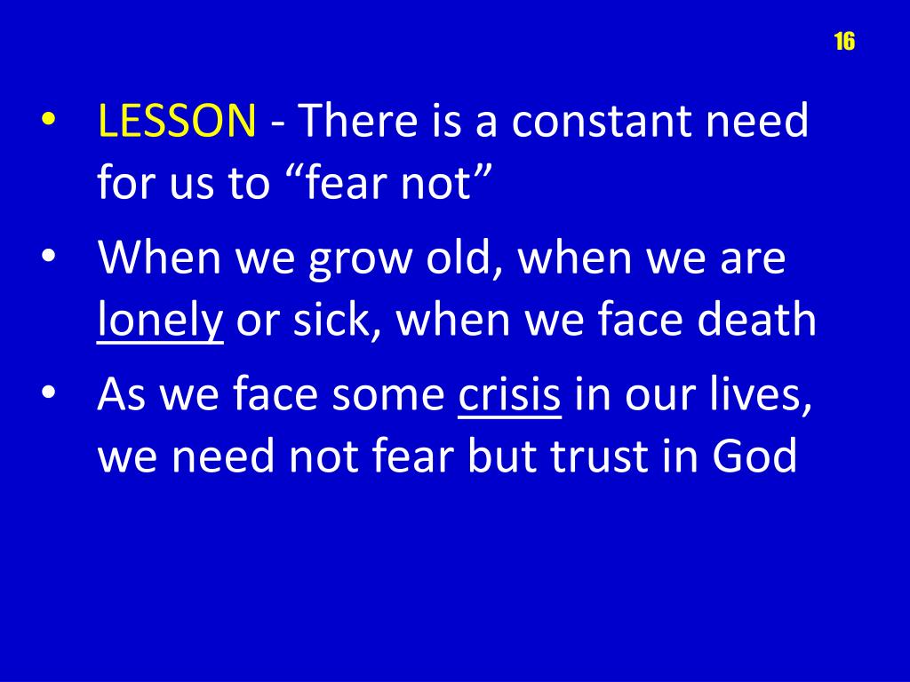 LESSON - There is a constant need for us to “fear not” When we grow old, when we are lonely or sick, when we face death As we face some crisis in our lives, we need not fear but trust in God