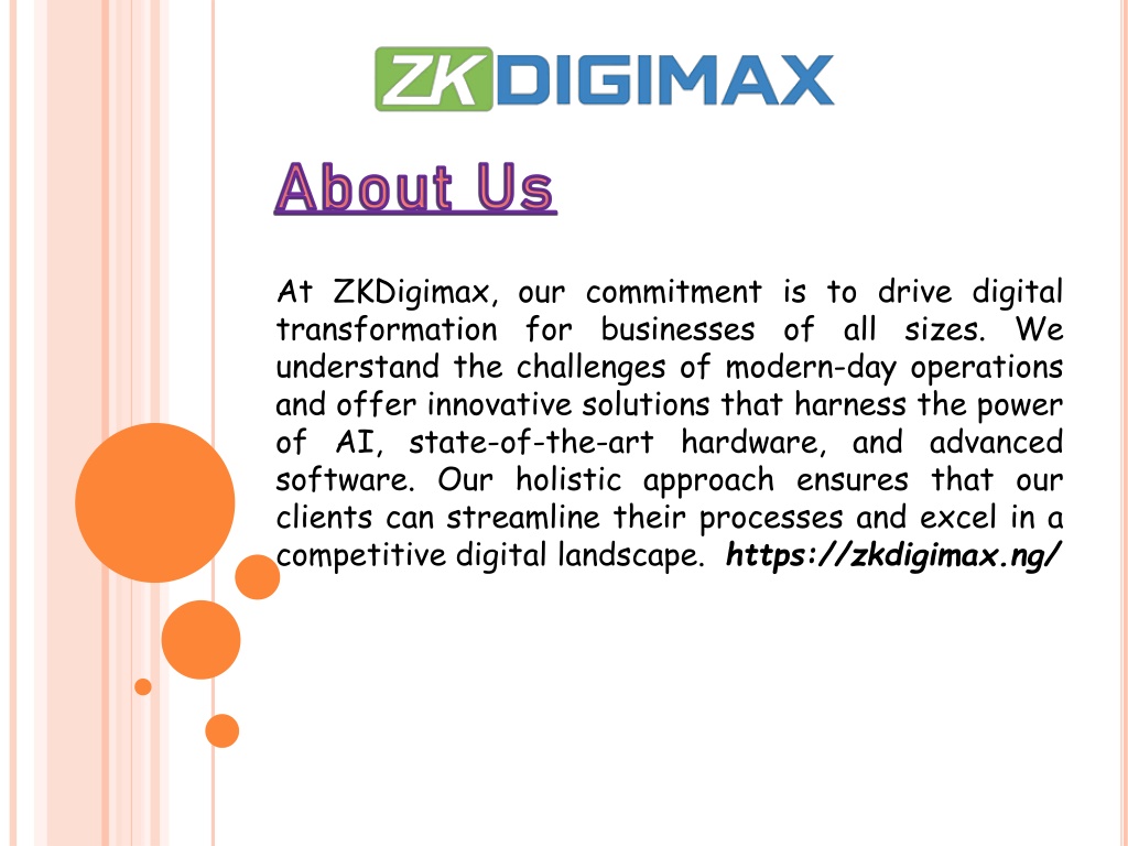 About Us At ZKDigimax, our commitment is to drive digital transformation for businesses of all sizes. We understand the challenges of modern-day operations and offer innovative solutions that harness the power of AI, state-of-the-art hardware, and advanced software. Our holistic approach ensures that our clients can streamline their processes and excel in a competitive digital landscape. https://zkdigimax.ng/