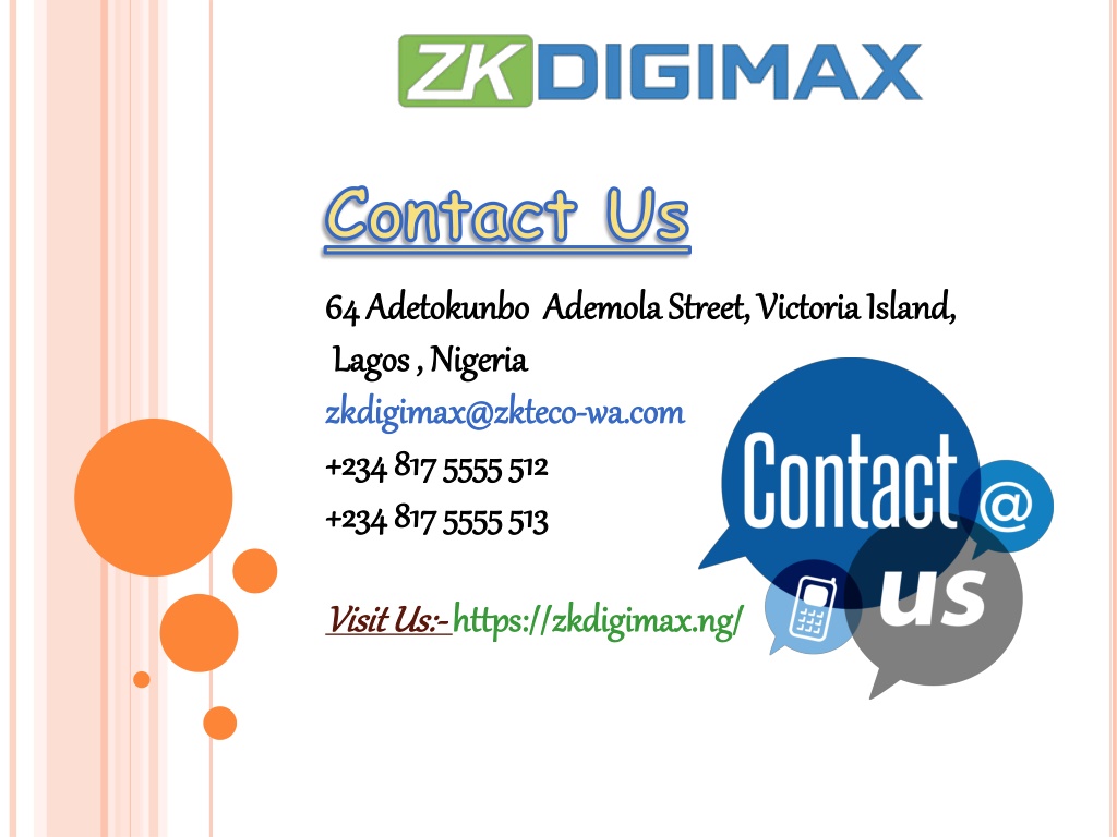 Contact Us 64 AdetokunboAdemola Street, Victoria Island, Lagos , Nigeria zkdigimax@zkteco-wa.com +234 817 5555 512 +234 817 5555 513 Visit Us:- https://zkdigimax.ng/