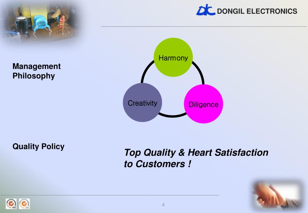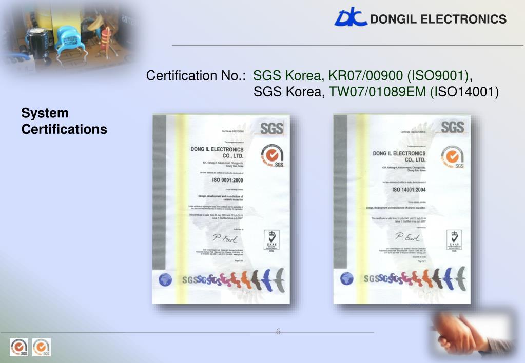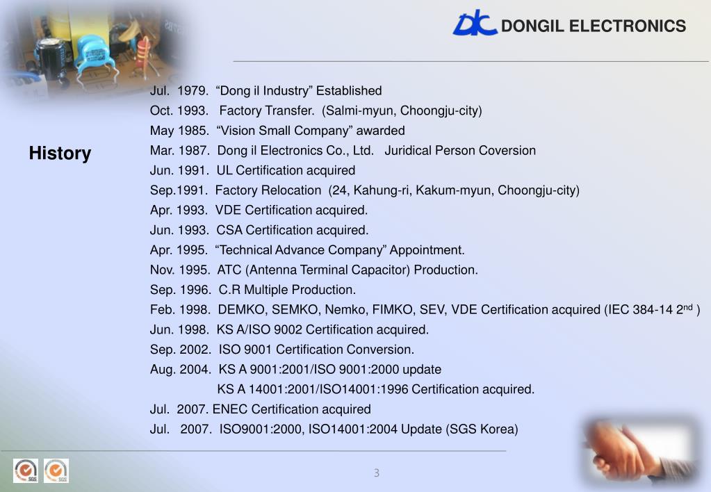 Jul. 1979. “Dong il Industry” Established Oct. 1993. Factory Transfer. (Salmi-myun, Choongju-city) May 1985. “Vision Small Company” awarded Mar. 1987. Dong il Electronics Co., Ltd. Juridical Person Coversion Jun. 1991. UL Certification acquired Sep.1991. Factory Relocation (24, Kahung-ri, Kakum-myun, Choongju-city) Apr. 1993. VDE Certification acquired. Jun. 1993. CSA Certification acquired. Apr. 1995. “Technical Advance Company” Appointment. Nov. 1995. ATC (Antenna Terminal Capacitor) Production. Sep. 1996. C.R Multiple Production. Feb. 1998. DEMKO, SEMKO, Nemko, FIMKO, SEV, VDE Certification acquired (IEC 384-14 2nd ) Jun. 1998. KS A/ISO 9002 Certification acquired. Sep. 2002. ISO 9001 Certification Conversion. Aug. 2004. KS A 9001:2001/ISO 9001:2000 update KS A 14001:2001/ISO14001:1996 Certification acquired. Jul. 2007. ENEC Certification acquired Jul. 2007. ISO9001:2000, ISO14001:2004 Update (SGS Korea) History