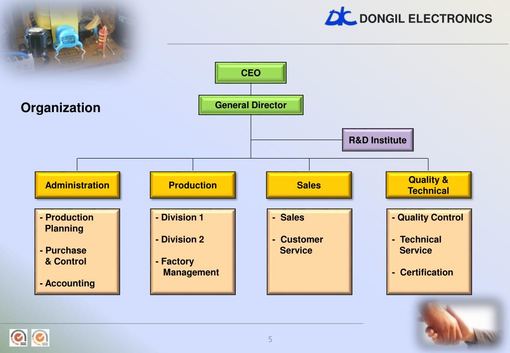 CEO General Director Organization R&D Institute Administration Production Sales Quality & Technical - Production Planning - Purchase & Control - Accounting - Division 1 - Division 2 - Factory Management - Sales - Customer Service - Quality Control - Technical Service - Certification