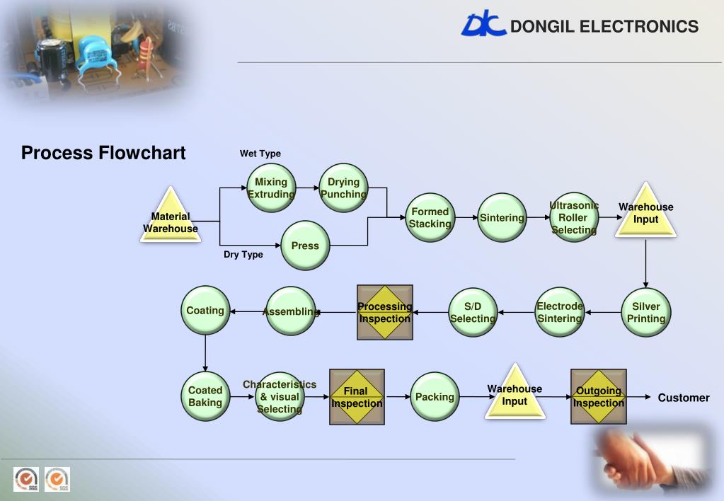Processing Inspection Final Inspection Outgoing Inspection Wet Type Process Flowchart Mixing Extruding Drying Punching Ultrasonic Roller Selecting Formed Stacking Sintering Warehouse Input Material Warehouse Press Dry Type Coating Assembling Electrode Sintering S/D Selecting Silver Printing Coated Baking Characteristics & visual Selecting Packing Warehouse Input Customer