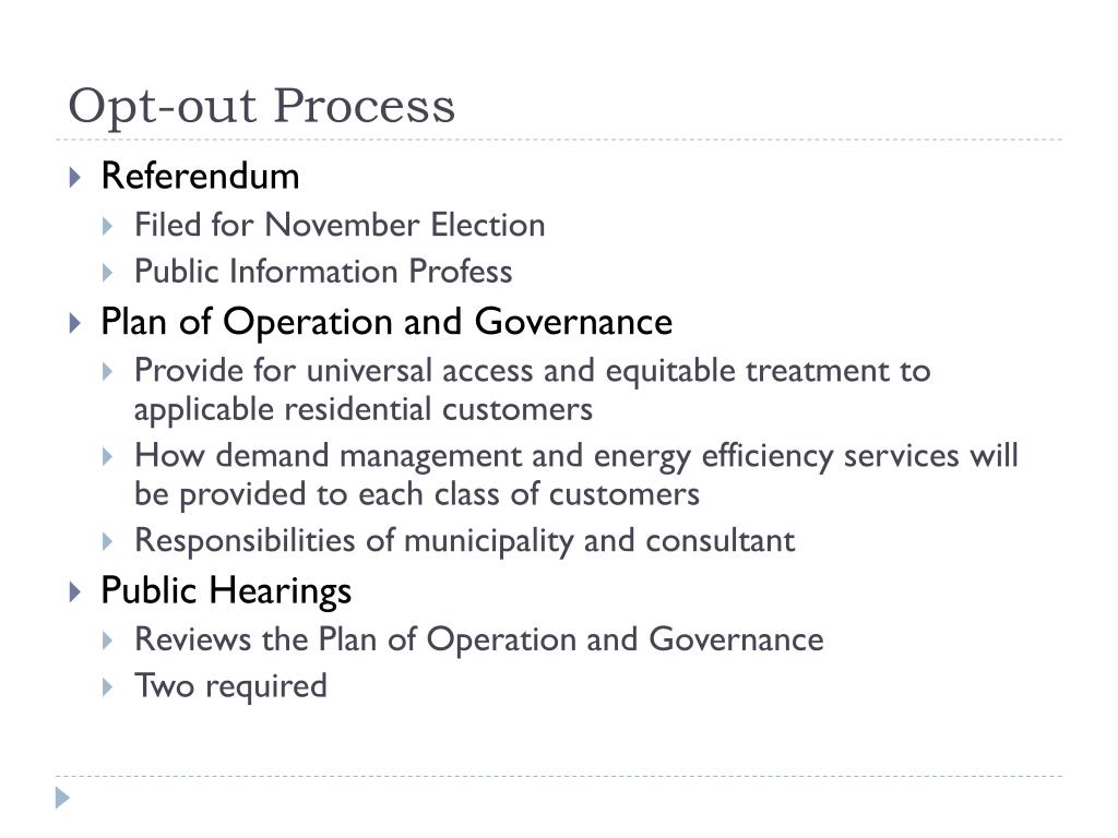 Opt-out Process • Referendum • Filed for November Election • Public Information Profess • Plan of Operation and Governance • Provide for universal access and equitable treatment to applicable residential customers • How demand management and energy efficiency services will be provided to each class of customers • Responsibilities of municipality and consultant • Public Hearings • Reviews the Plan of Operation and Governance • Two required