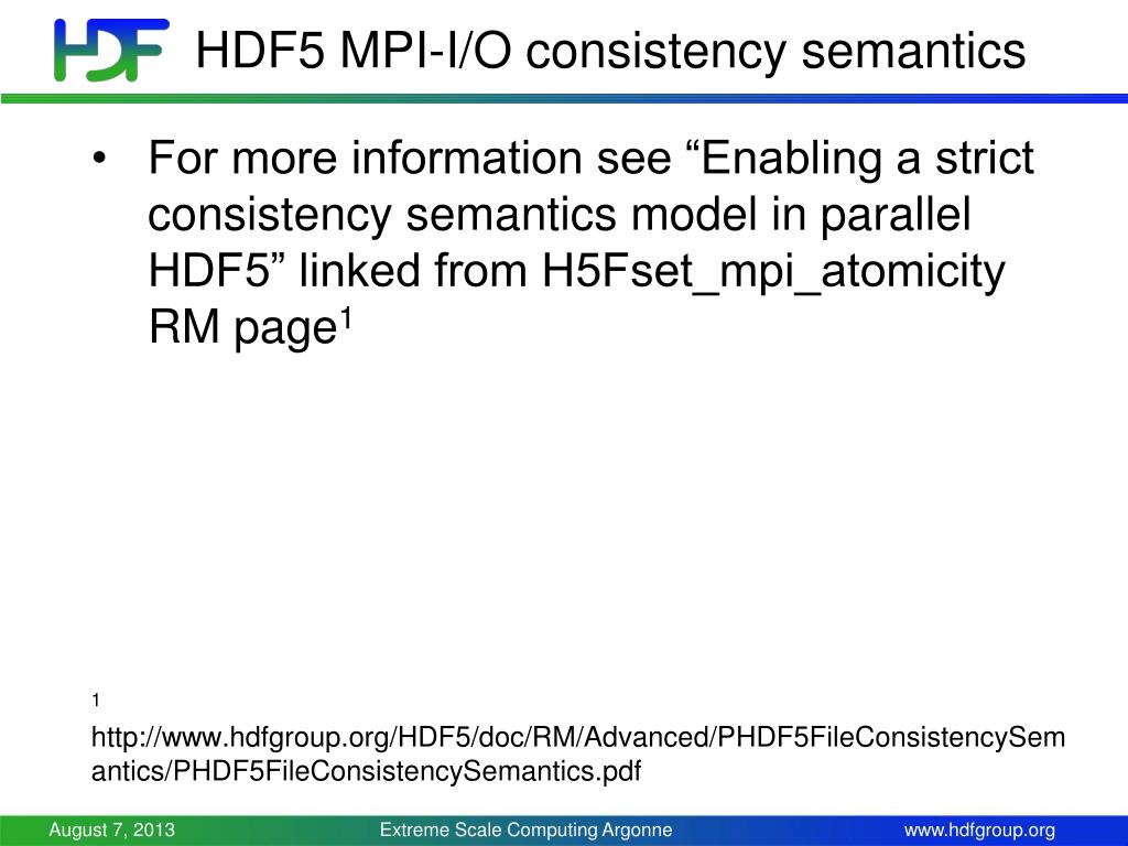 HDF5 MPI-I/O consistency semantics • Same as MPI-I/O semantics • Default MPI-I/O semantics doesn’t guarantee atomicity or sequence of calls! • Problems may occur (although we haven’t seen any) when writing/reading HDF5 metadata or raw data Extreme Scale Computing Argonne