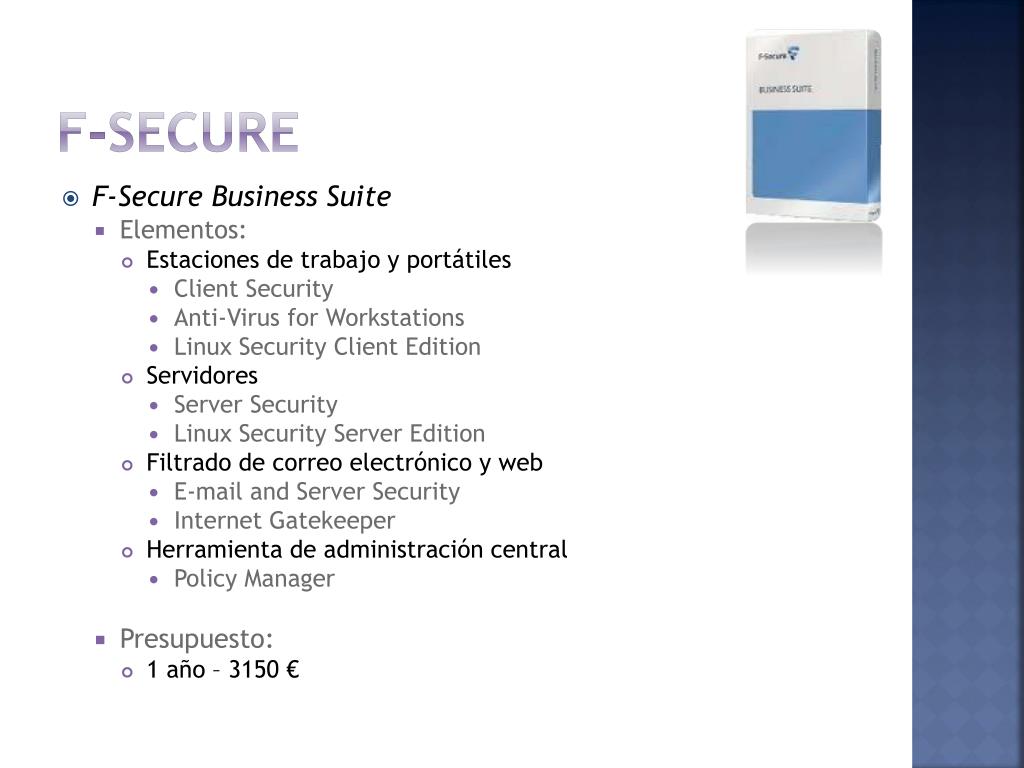 F-Secure • F-Secure Business Suite • Elementos: • Estaciones de trabajo y portátiles • Client Security • Anti-Virus for Workstations • Linux Security Client Edition • Servidores • Server Security • Linux Security Server Edition • Filtrado de correo electrónico y web • E-mail and Server Security • Internet Gatekeeper • Herramienta de administración central • Policy Manager • Presupuesto: • 1 año – 3150 €