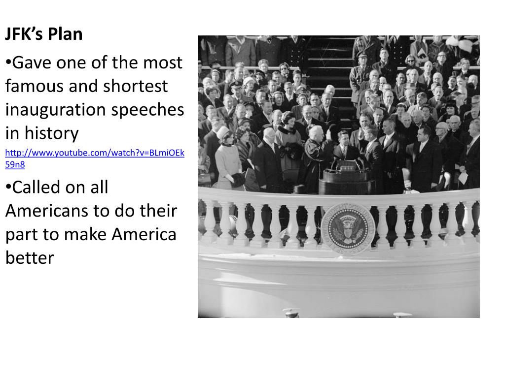 JFK’s Plan Gave one of the most famous and shortest inauguration speeches in history http://www.youtube.com/watch?v=BLmiOEk59n8 Called on all Americans to do their part to make America better