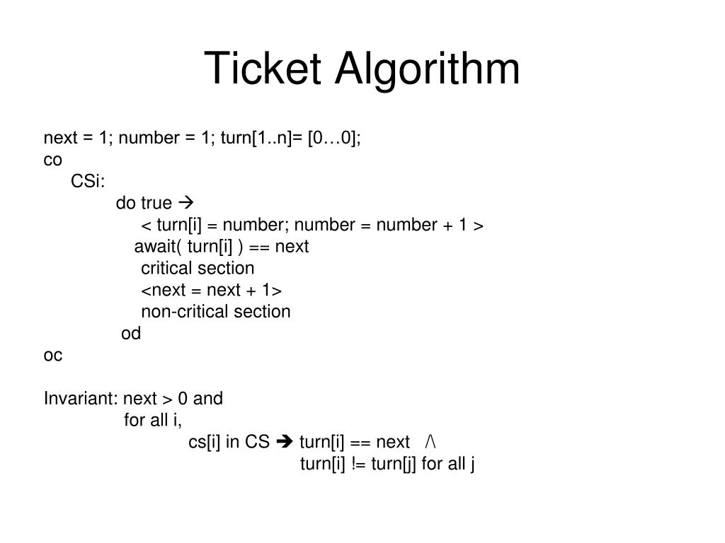 Ticket Algorithm next = 1; number = 1; turn[1..n]= [0…0]; co CSi: do true < turn[i] = number; number = number + 1 > await( turn[i] ) == next critical section <next = next + 1> non-critical section od oc Invariant: next > 0 and for all i, cs[i] in CS turn[i] == next /\ turn[i] != turn[j] for all j