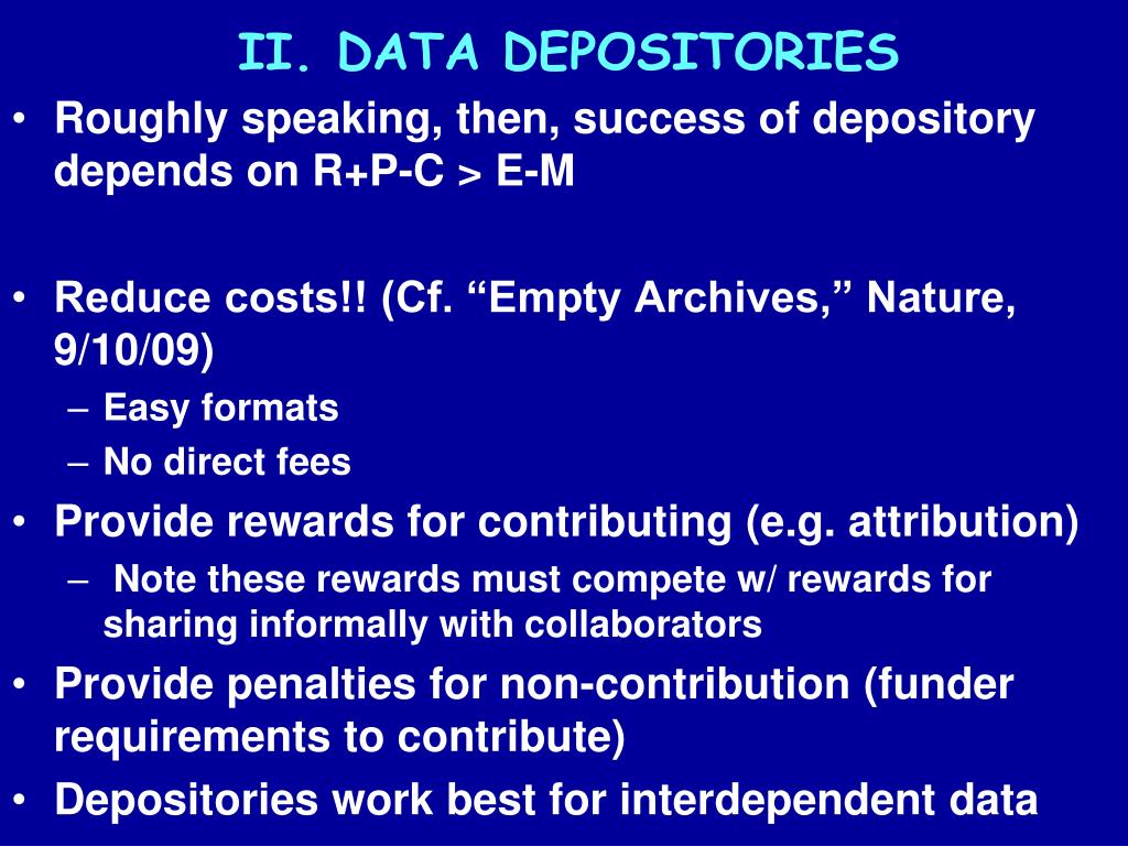 II. DATA DEPOSITORIES • Roughly speaking, then, success of depository depends on R+P-C > E-M • Reduce costs!! (Cf. “Empty Archives,” Nature, 9/10/09) • Easy formats • No direct fees • Provide rewards for contributing (e.g. attribution) • Note these rewards must compete w/ rewards for sharing informally with collaborators • Provide penalties for non-contribution (funder requirements to contribute) • Depositories work best for interdependent data
