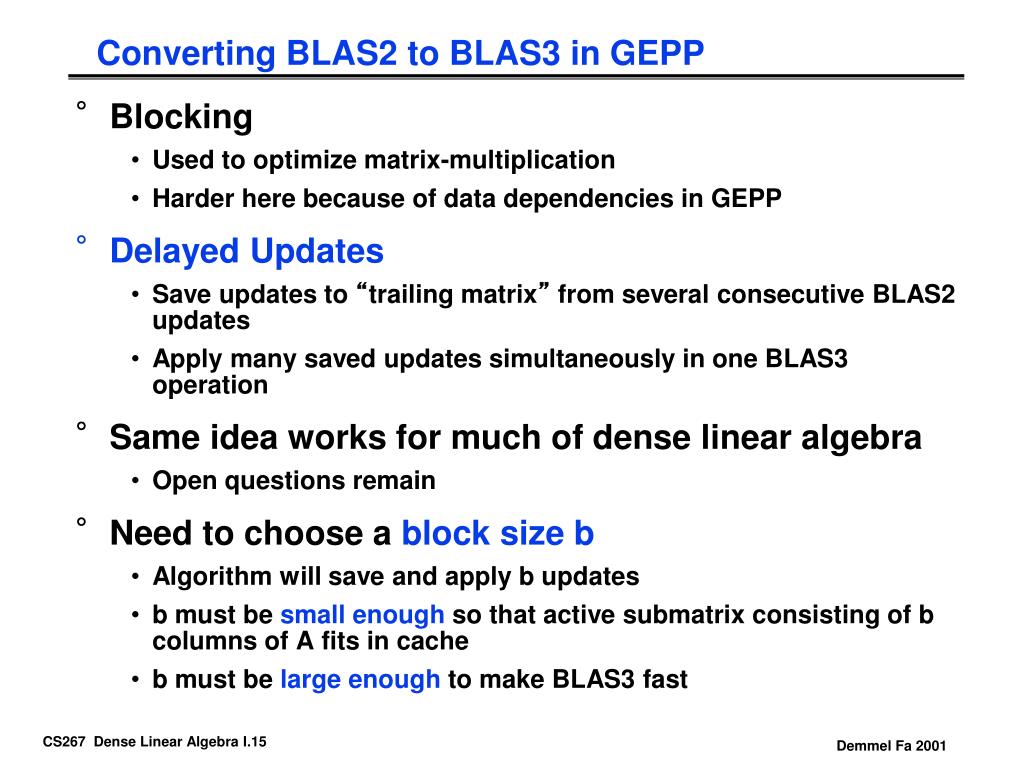 Blocked GEPP (www.netlib.org/lapack/single/sgetrf.f) for ib = 1 to n-1 step b … Process matrix b columns at a time end = ib + b-1 … Point to end of block of b columns apply BLAS2 version of GEPP to get A(ib:n , ib:end) = P’ * L’ * U’ … let LL denote the strict lower triangular part of A(ib:end , ib:end) + I A(ib:end , end+1:n) = LL-1 * A(ib:end , end+1:n)… update next b rows of U A(end+1:n , end+1:n ) = A(end+1:n , end+1:n ) - A(end+1:n , ib:end) * A(ib:end , end+1:n) … apply delayed updates with single matrix-multiply … with inner dimension b