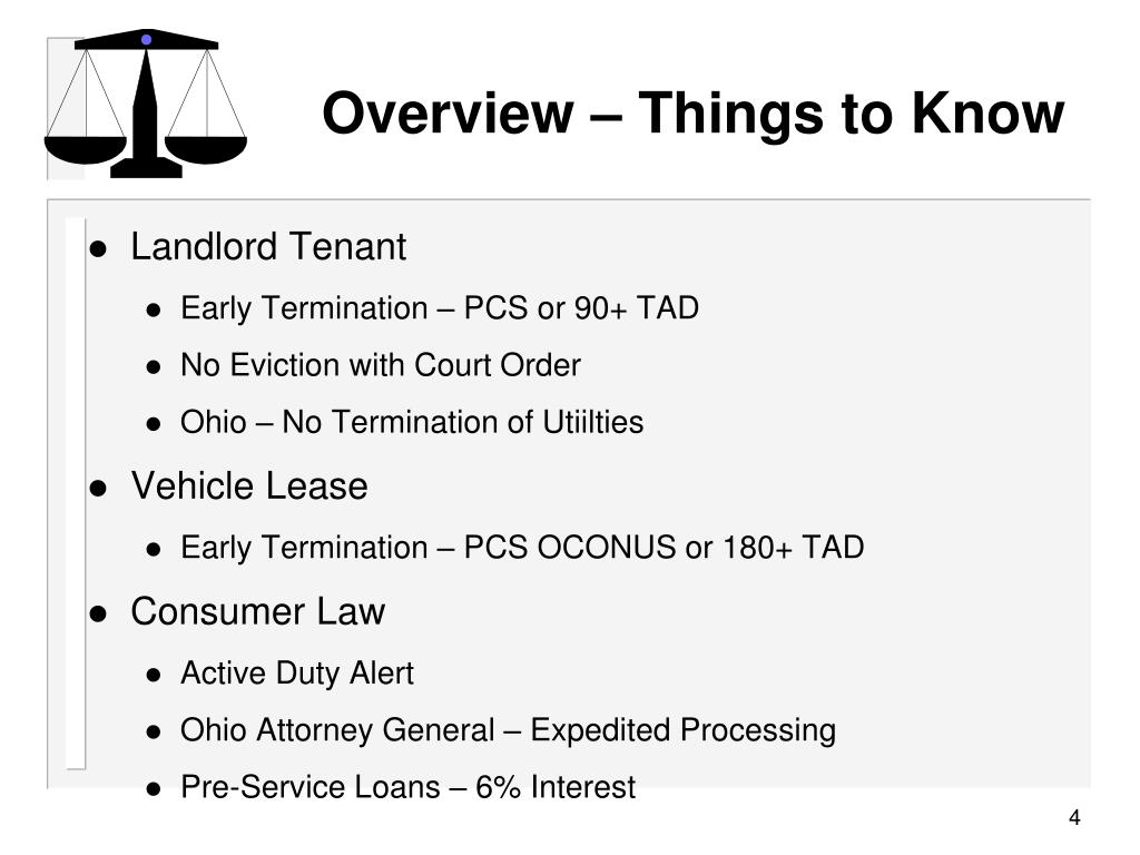 Overview – Things to Know • Landlord Tenant • Early Termination – PCS or 90+ TAD • No Eviction with Court Order • Ohio – No Termination of Utiilties • Vehicle Lease • Early Termination – PCS OCONUS or 180+ TAD • Consumer Law • Active Duty Alert • Ohio Attorney General – Expedited Processing • Pre-Service Loans – 6% Interest