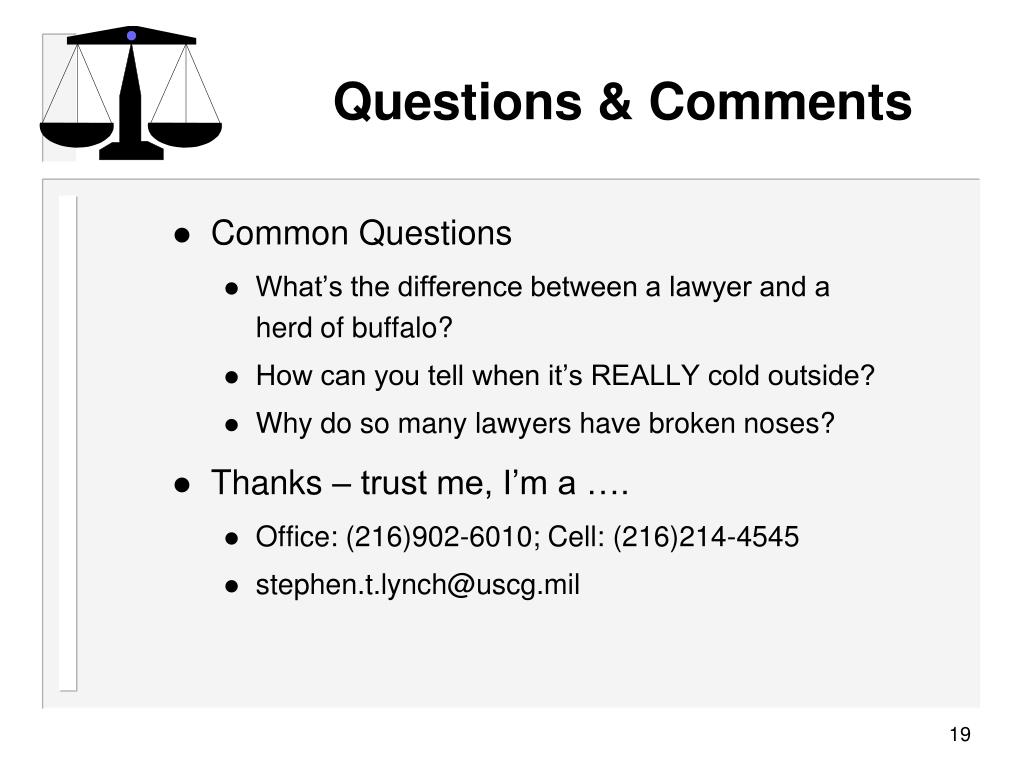 Questions & Comments • Common Questions • What’s the difference between a lawyer and a herd of buffalo? • How can you tell when it’s REALLY cold outside? • Why do so many lawyers have broken noses? • Thanks – trust me, I’m a …. • Office: (216)902-6010; Cell: (216)214-4545 • stephen.t.lynch@uscg.mil