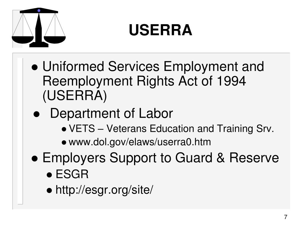 USERRA • Uniformed Services Employment and Reemployment Rights Act of 1994 (USERRA) • Department of Labor • VETS – Veterans Education and Training Srv. • www.dol.gov/elaws/userra0.htm • Employers Support to Guard & Reserve • ESGR • http://esgr.org/site/