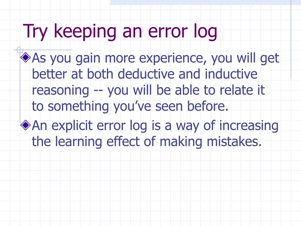Try keeping an error log • As you gain more experience, you will get better at both deductive and inductive reasoning -- you will be able to relate it to something you’ve seen before. • An explicit error log is a way of increasing the learning effect of making mistakes.