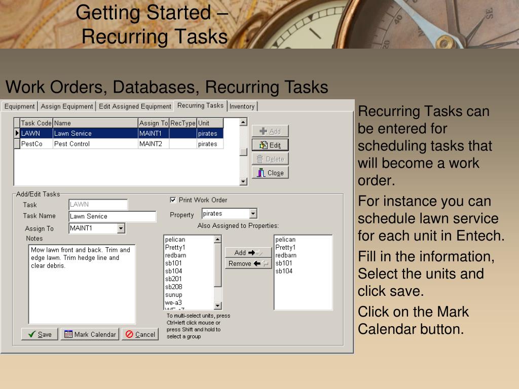 Getting Started – Recurring Tasks Work Orders, Databases, Recurring Tasks Recurring Tasks can be entered for scheduling tasks that will become a work order. For instance you can schedule lawn service for each unit in Entech. Fill in the information, Select the units and click save. Click on the Mark Calendar button.