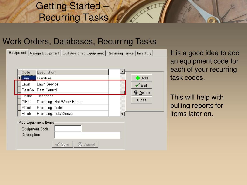 Getting Started – Recurring Tasks Work Orders, Databases, Recurring Tasks It is a good idea to add an equipment code for each of your recurring task codes. This will help with pulling reports for items later on.