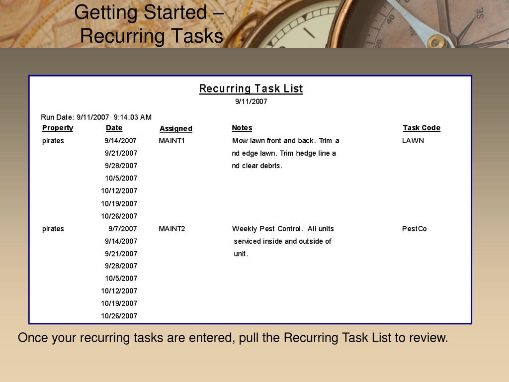 Getting Started – Recurring Tasks Once your recurring tasks are entered, pull the Recurring Task List to review.
