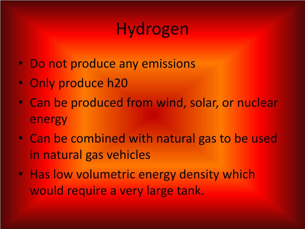 Hydrogen • Do not produce any emissions • Only produce h20 • Can be produced from wind, solar, or nuclear energy • Can be combined with natural gas to be used in natural gas vehicles • Has low volumetric energy density which would require a very large tank.