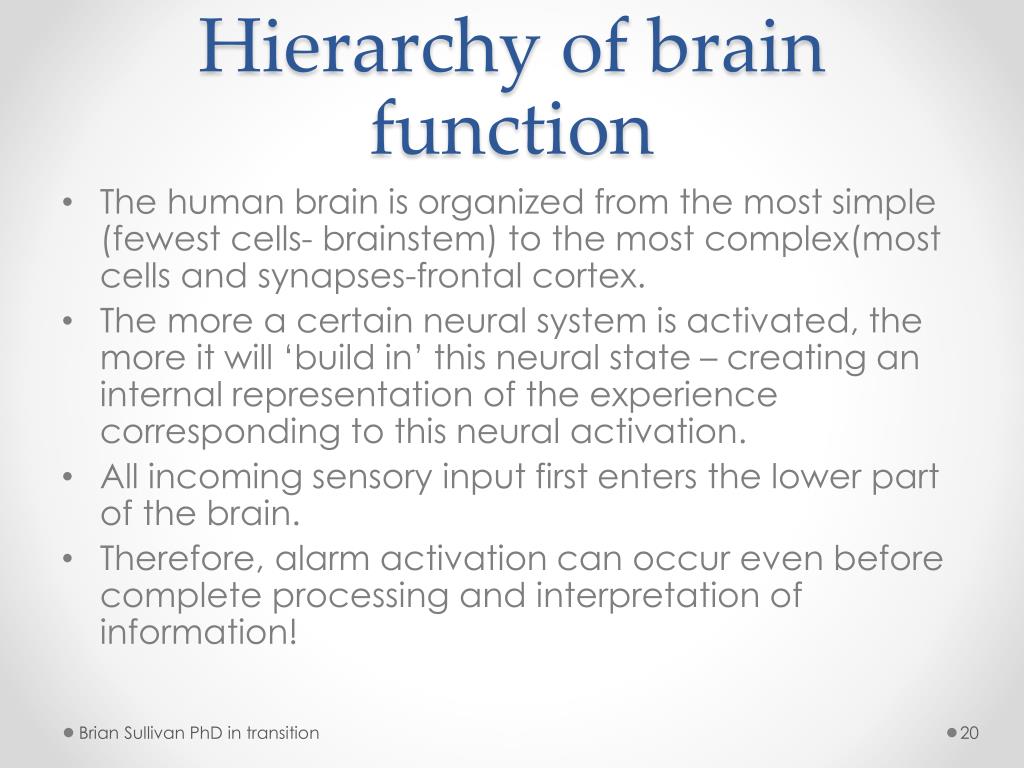 Hierarchy of brain function • The human brain is organized from the most simple (fewest cells- brainstem) to the most complex(most cells and synapses-frontal cortex. • The more a certain neural system is activated, the more it will ‘build in’ this neural state – creating an internal representation of the experience corresponding to this neural activation. • All incoming sensory input first enters the lower part of the brain. • Therefore, alarm activation can occur even before complete processing and interpretation of information! Brian Sullivan PhD in transition