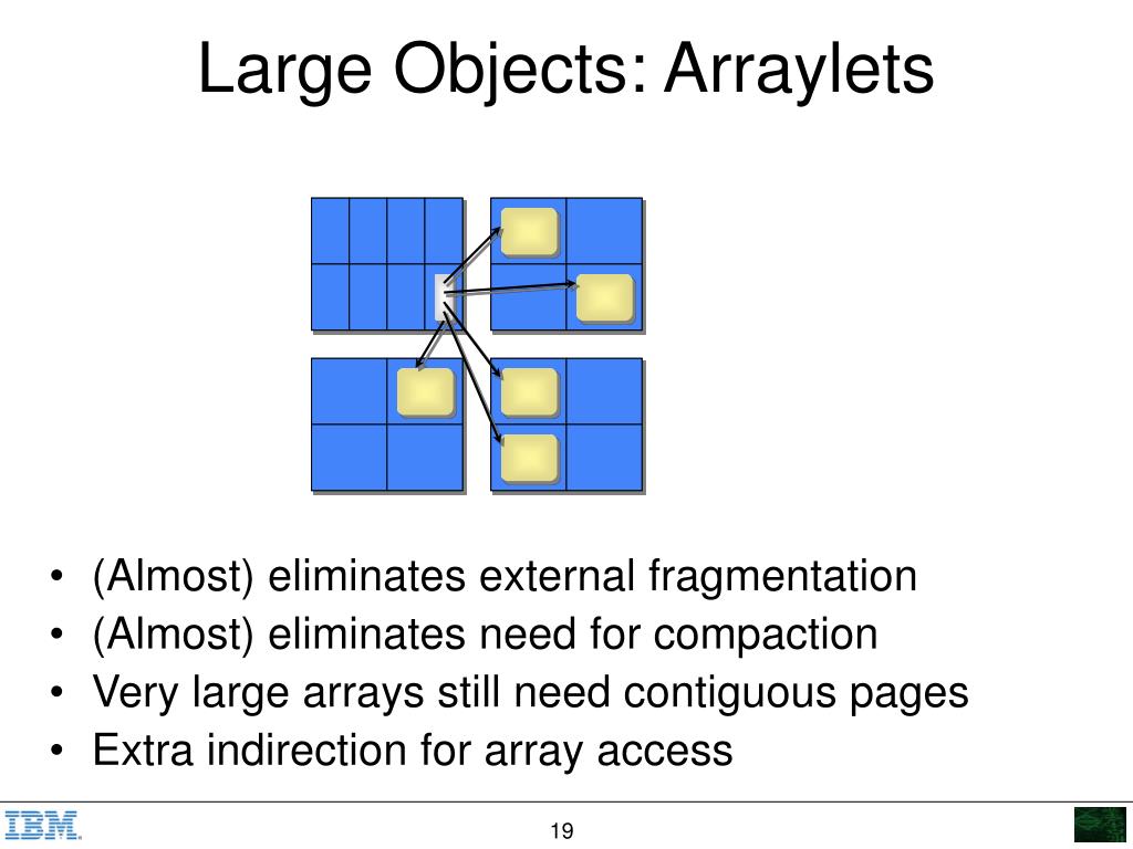 Large Objects: Arraylets • (Almost) eliminates external fragmentation • (Almost) eliminates need for compaction • Very large arrays still need contiguous pages • Extra indirection for array access