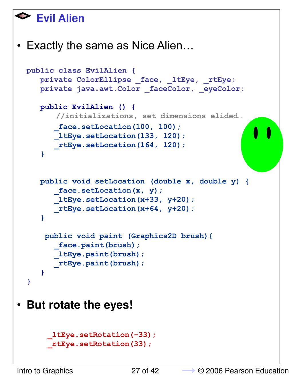 Evil Alien • Exactly the same as Nice Alien… public class EvilAlien { private ColorEllipse _face, _ltEye, _rtEye; private java.awt.Color _faceColor, _eyeColor; public EvilAlien () { //initializations, set dimensions elided… • But rotate the eyes! _face.setLocation(100, 100); _ltEye.setLocation(133, 120); _rtEye.setLocation(164, 120); } public void setLocation (double x, double y) { _face.setLocation(x, y); _ltEye.setLocation(x+33, y+20); _rtEye.setLocation(x+64, y+20); } public void paint (Graphics2D brush){ _face.paint(brush); _ltEye.paint(brush); _rtEye.paint(brush); } } _ltEye.setRotation(-33); _rtEye.setRotation(33); Intro to Graphics