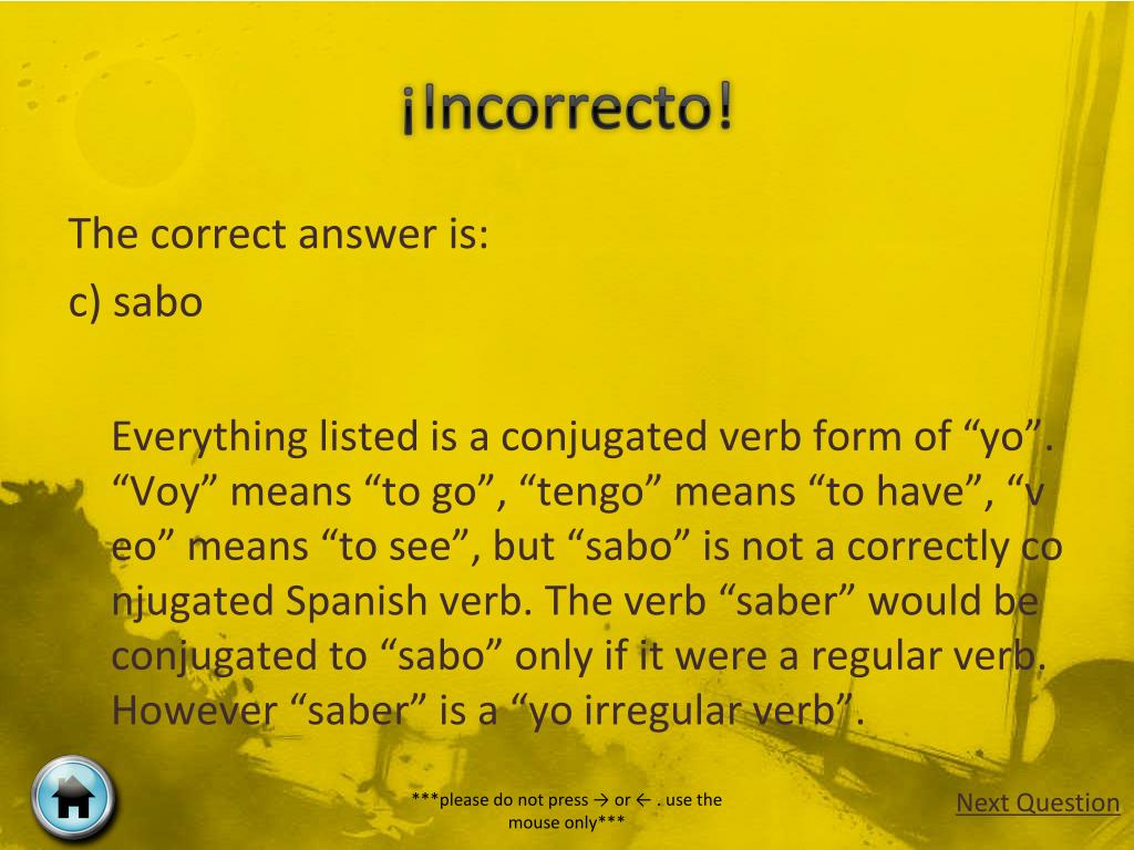 ¡Incorrecto! The correct answer is: c) sabo Everything listed is a conjugated verb form of “yo”. “Voy” means “to go”, “tengo” means “to have”, “veo” means “to see”, but “sabo” is not a correctly conjugated Spanish verb. The verb “saber” would be conjugated to “sabo” only if it were a regular verb. However “saber” is a “yo irregular verb”. Next Question ***please do not press → or ← . use the mouse only***