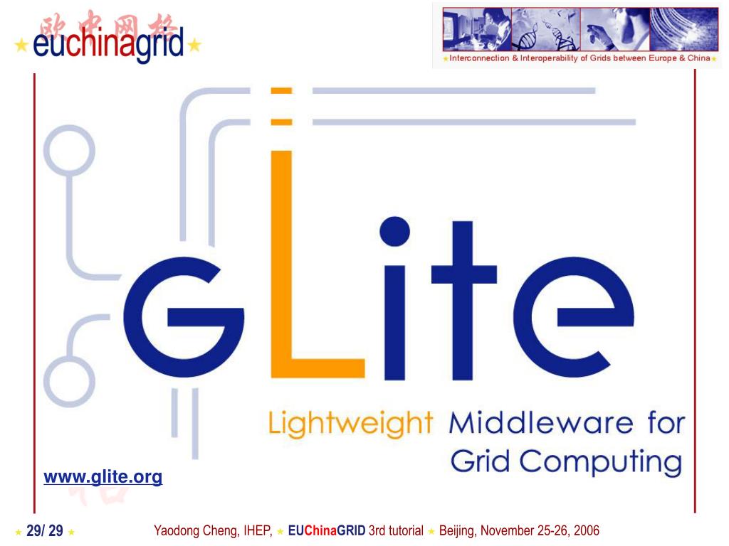 Further information • EGEE http://cern.ch/egee • gLite http://cern.ch/glite • euchinagrid: http://www.euchinagrid.org