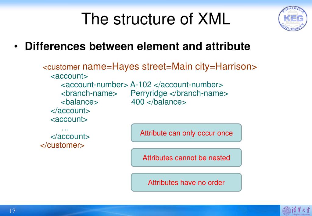 The structure of XML • Differences between element and attribute <customer name=Hayes street=Main city=Harrison> <account> <account-number> A-102 </account-number> <branch-name> Perryridge </branch-name> <balance> 400 </balance> </account> <account> … </account> </customer> Attribute can only occur once Attributes cannot be nested Attributes have no order
