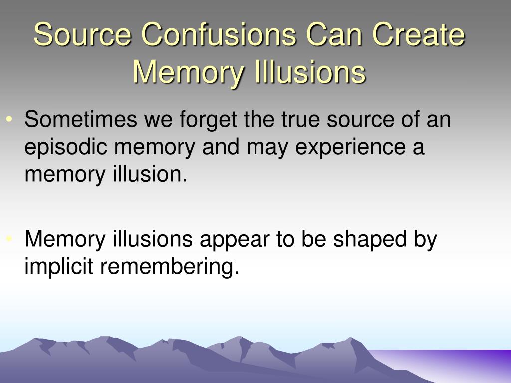 Source Confusions Can Create Memory Illusions • Sometimes we forget the true source of an episodic memory and may experience a memory illusion. • Memory illusions appear to be shaped by implicit remembering.