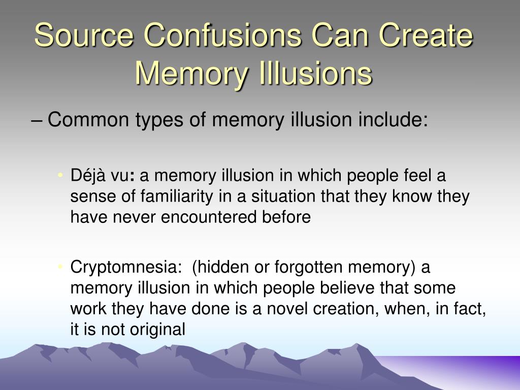 Source Confusions Can Create Memory Illusions • Common types of memory illusion include: • Déjà vu: a memory illusion in which people feel a sense of familiarity in a situation that they know they have never encountered before • Cryptomnesia: (hidden or forgotten memory) a memory illusion in which people believe that some work they have done is a novel creation, when, in fact, it is not original