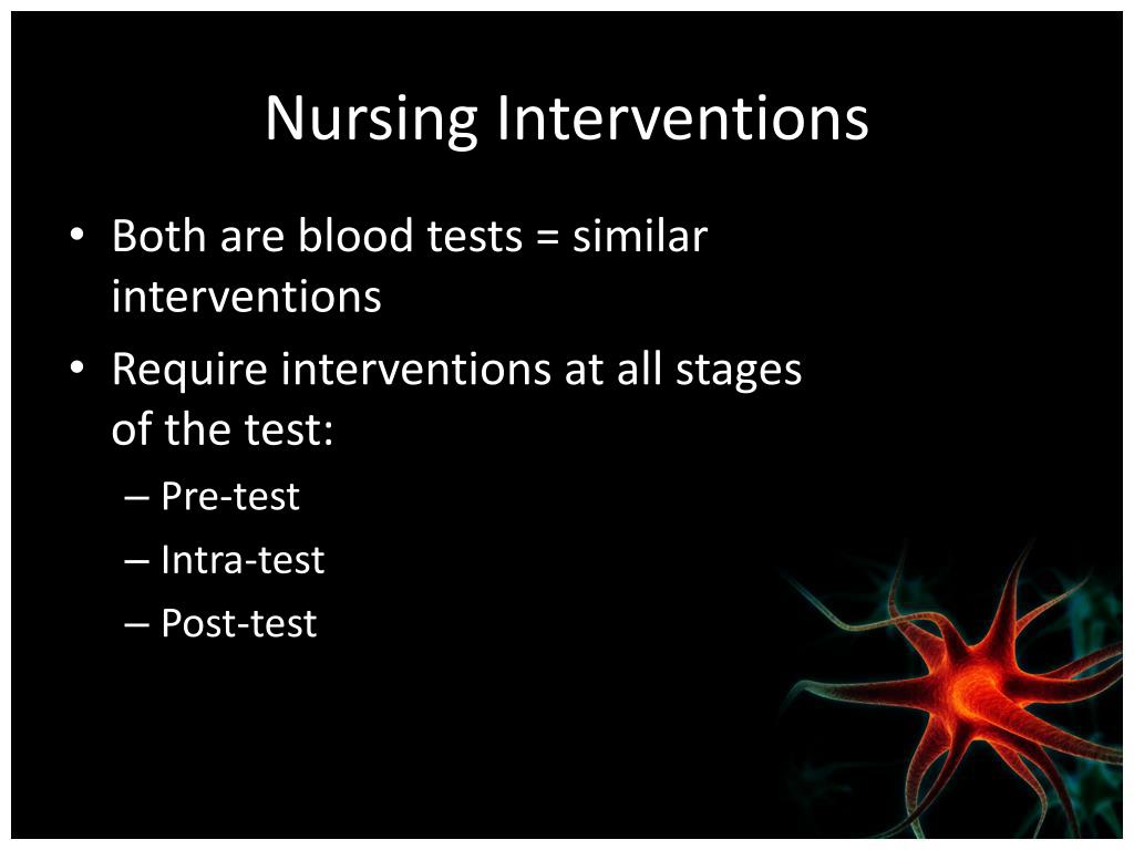 Nursing Interventions • Both are blood tests = similar interventions • Require interventions at all stages of the test: • Pre-test • Intra-test • Post-test